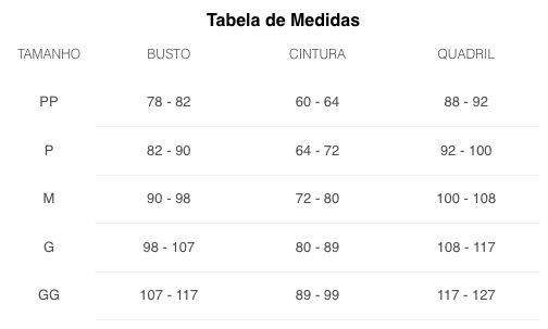 Medidas do modelo para referência: Altura 1,75 m | Busto 77 cm | Cintura 59 cm | Quadril 88 cm | Tamanho usado: P/36.